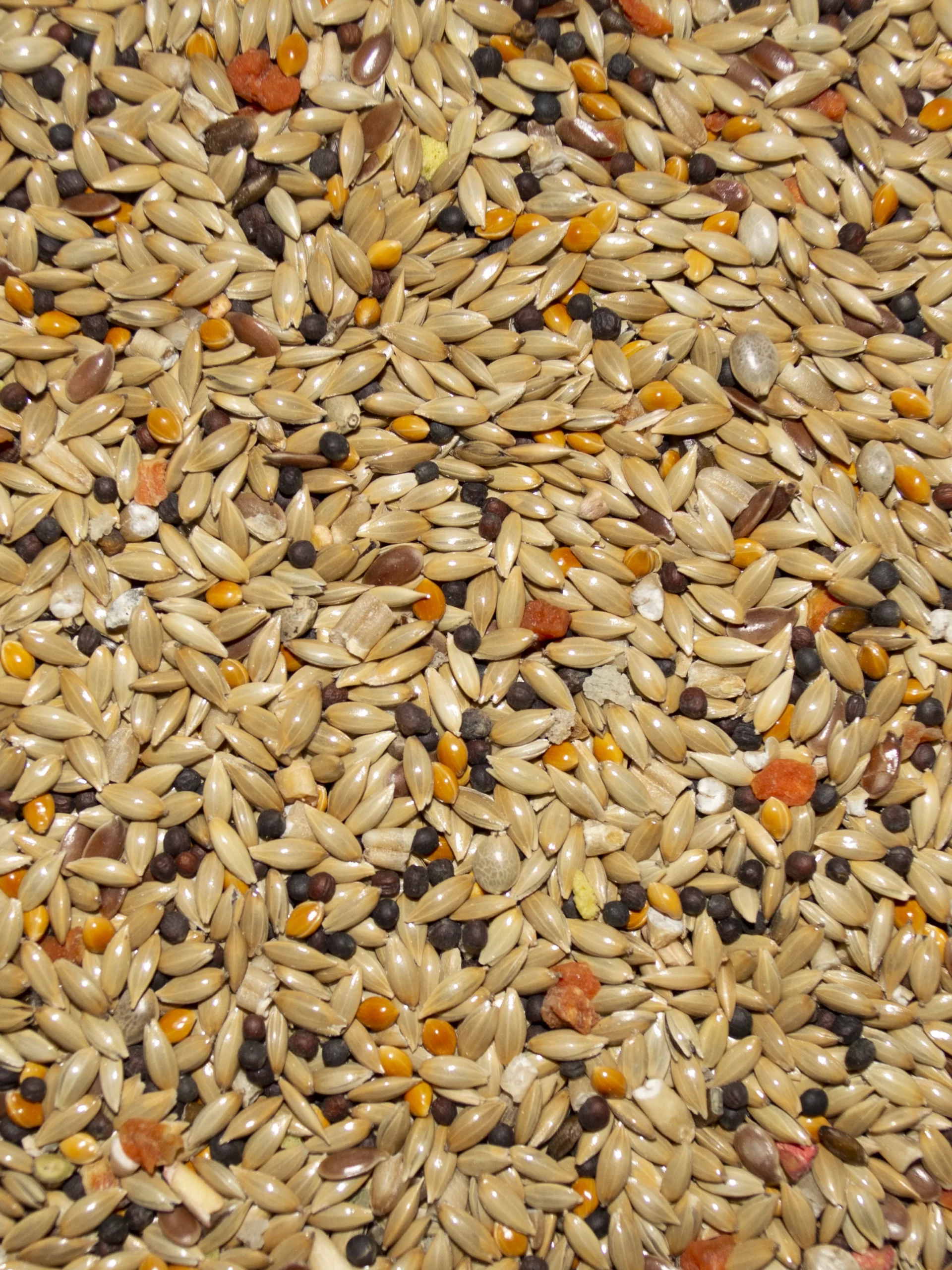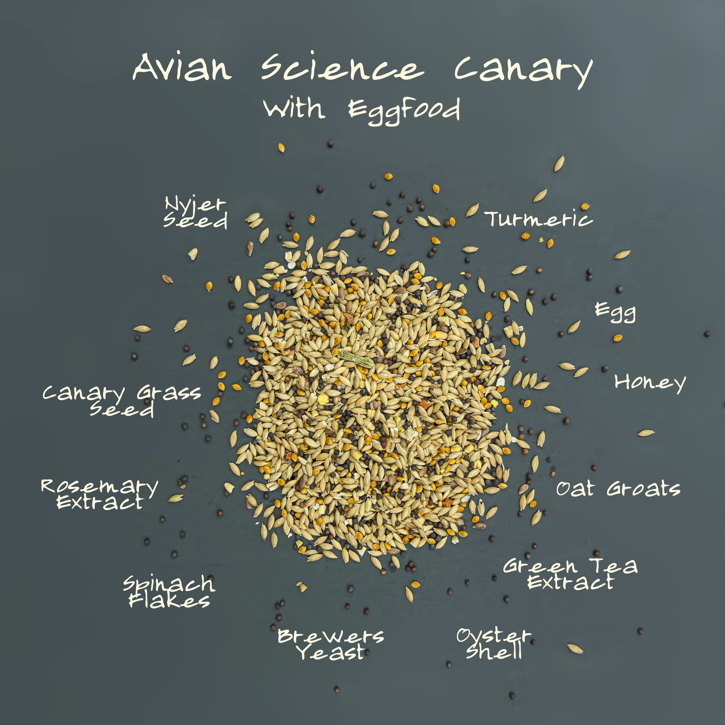Canary Grass Seed, Canola Seed, Millet, Oat Groats, Flax Seed, Wheat Flour, Corn Flour, Egg, Wheat Gluten, Nyjer Seed, Turmeric, Dried Milk, Dicalcium Phosphate, Brewers Dried Yeast, Calcium Carbonate, Salt, Algae Meal, Condensed Cultured Skim Milk, DL-Methionine, L-Lysine, Potassium Chloride, Choline Chloride, Lecithin, Wheat Germ Meal, Mixed Tocopherols (preservative), Rosemary Extract, Green Tea Extract, Vitamin A Supplement, Vitamin D Supplement, Vitamin E Supplement, Zinc Sulfate, Niacin, Vitamin C Supplement, Ferrous Sulfate, Riboflavin Supplement, Pyridoxine Hydrochloride, Manganese Sulfate, Zinc Proteinate, Folic Acid, Calcium Iodate, Manganese Proteinate, Copper Proteinate, Biotin, Sodium Selenite, Cobalt Carbonate, Vitamin B12 Supplement, Dried Enterococcus Faecium Fermentation Product, Dried Lactobacillus Acidophilus Fermentation Product, Dried Lactobacillus Casei Fermentation Product, Corn Germ, Malted Barley Flour, Honey, Dehydrated Carrot, Oyster Shell, Dehydrated Spinach Flakes, Orange Oil Safflower Oil, Maize Distillers Dried Grains, Lime- stone, Mineral Oil, D-Calcium Pantothenate, Pyridoxine Hydrochloride, Thiamine Mononitrate, Niacin Supple- ment, Sugar, Vegetable/ Fruit Juice for color.