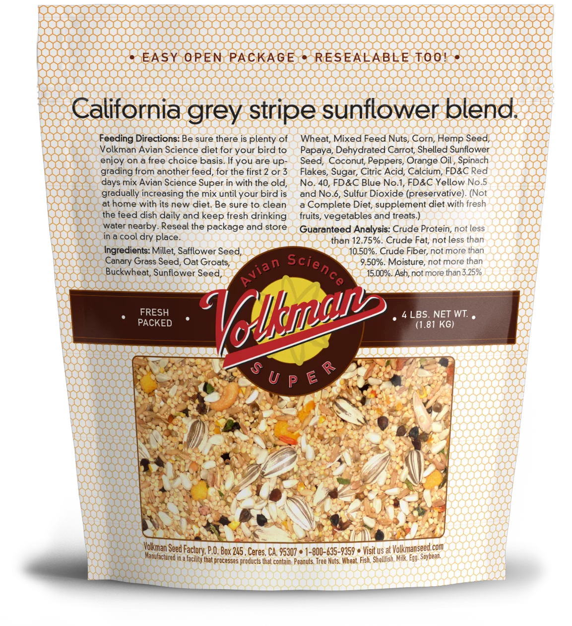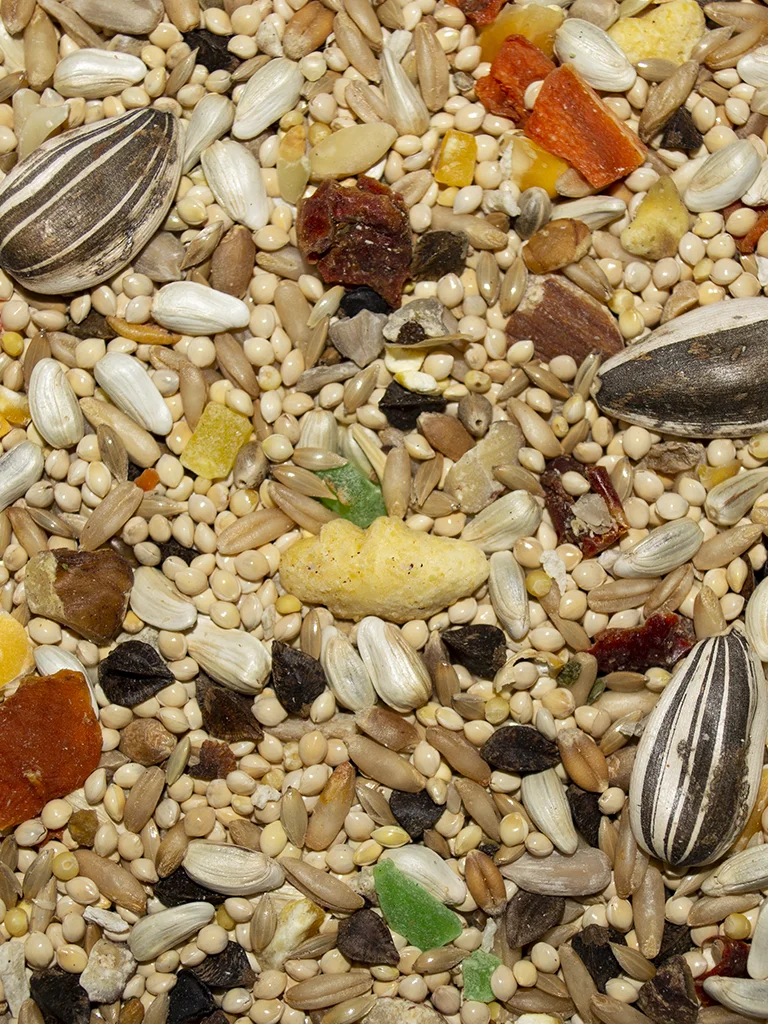Millet, Safflower Seed, Canary Grass Seed, Oat Groats, Buckwheat, Sunflower Seed, Wheat, Mixed Feed Nuts, Corn, Flax Seed, Papaya, Dehydrated Carrot, Shelled Sunflower Seed, Coconut, Peppers, Orange Oil, Spinach Flakes, Sugar, Citric Acid, Calcium, Vegetable/ Fruit Juice for color, Sulfur Dioxide (preservative).