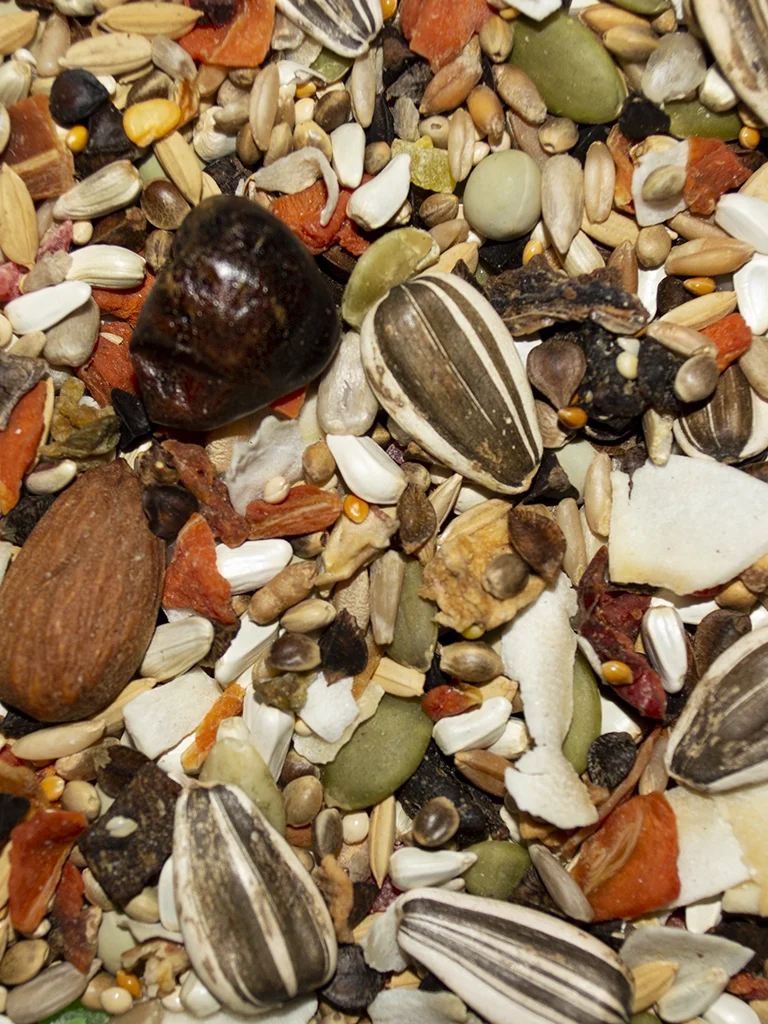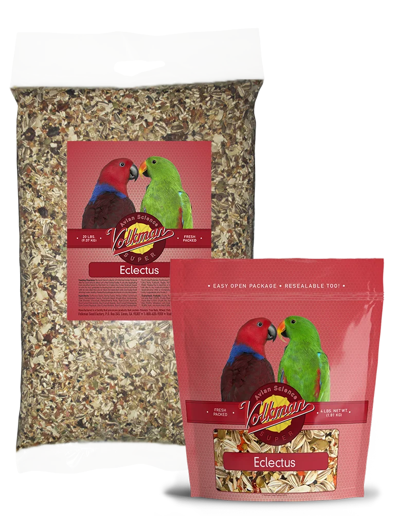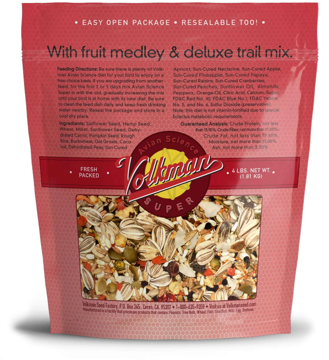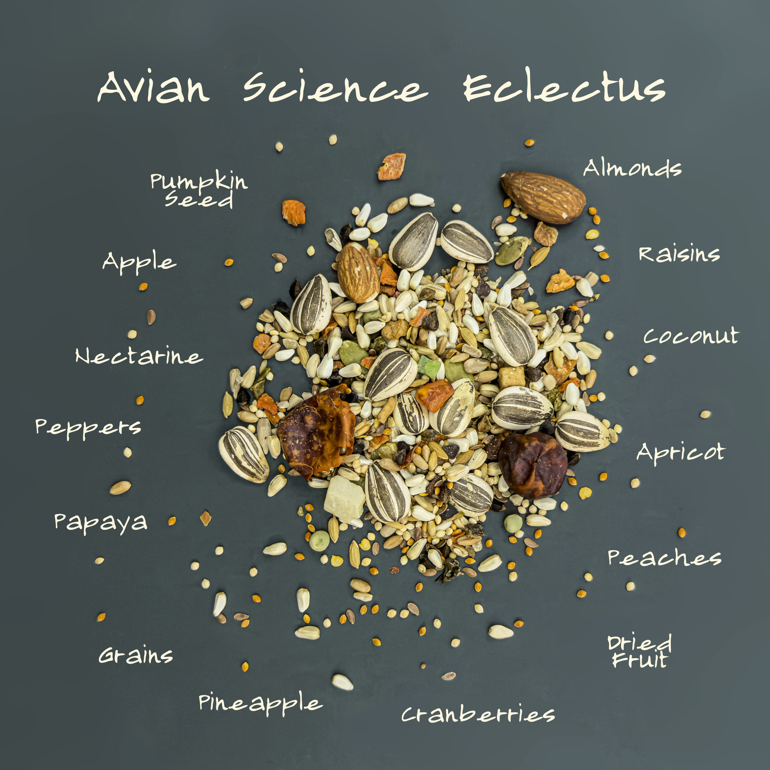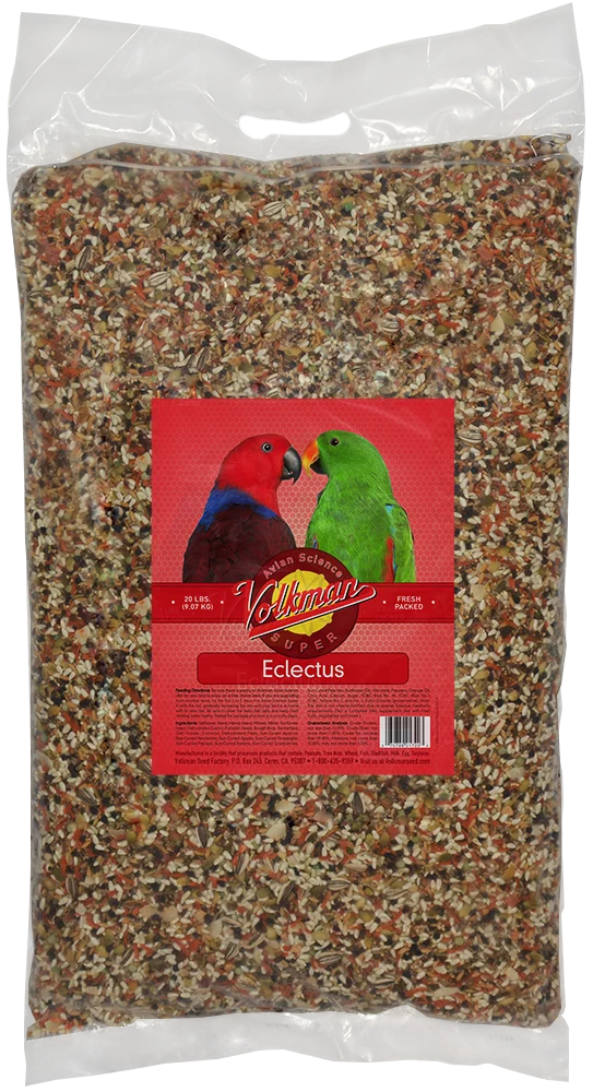 Safflower Seed, Flax Seed, Wheat, Millet, Sunflower Seed, Dehydrated Carrot, Pumpkin Seed, Rough Rice, Buckwheat, Oat Groats, Coconut, Dehydrated Peas, Sun-Cured Apricot, Sun-Cured Nectarine, Sun-Cured Apple, Sun-Cured Pineapple, Sun-Cured Papaya, Sun-Cured Raisins, Sun-Cured Cranberries, Sun-Cured Peaches, Sunflower Oil, Almonds, Peppers, Orange Oil, Citric Acid, Calcium, Sugar, Vegetable/ Fruit Juice for color, Sulfur Dioxide (preservative). Note: this diet is not vitamin-fortified due to special Eclectus metabolic requirements.