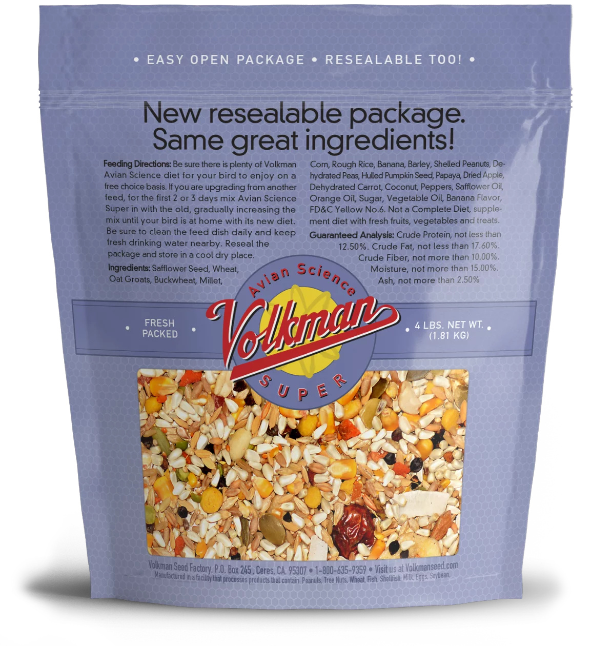 Safflower Seed, Wheat, Oat Groats, Buckwheat, Millet, Corn, Rough Rice, Banana, Barley, Shelled Peanuts, Dehydrated Peas, Hulled Pumpkin Seed, Papaya, Dried Apple, Dehydrated Carrot, Coconut, Peppers, Safflower Oil, Orange Oil, Sugar, Vegetable Oil, Banana Flavor, Vegetable/ Fruit Juice for color.