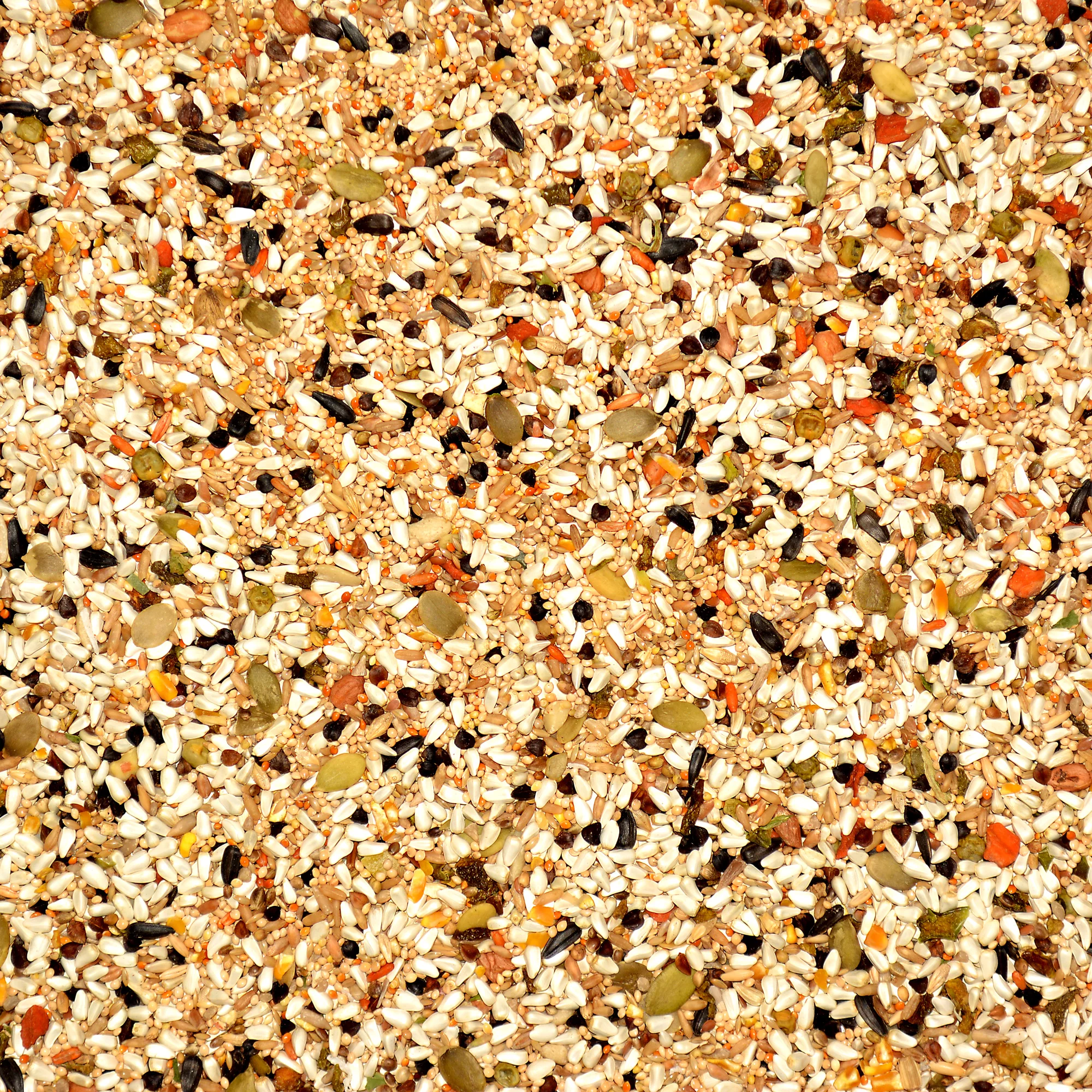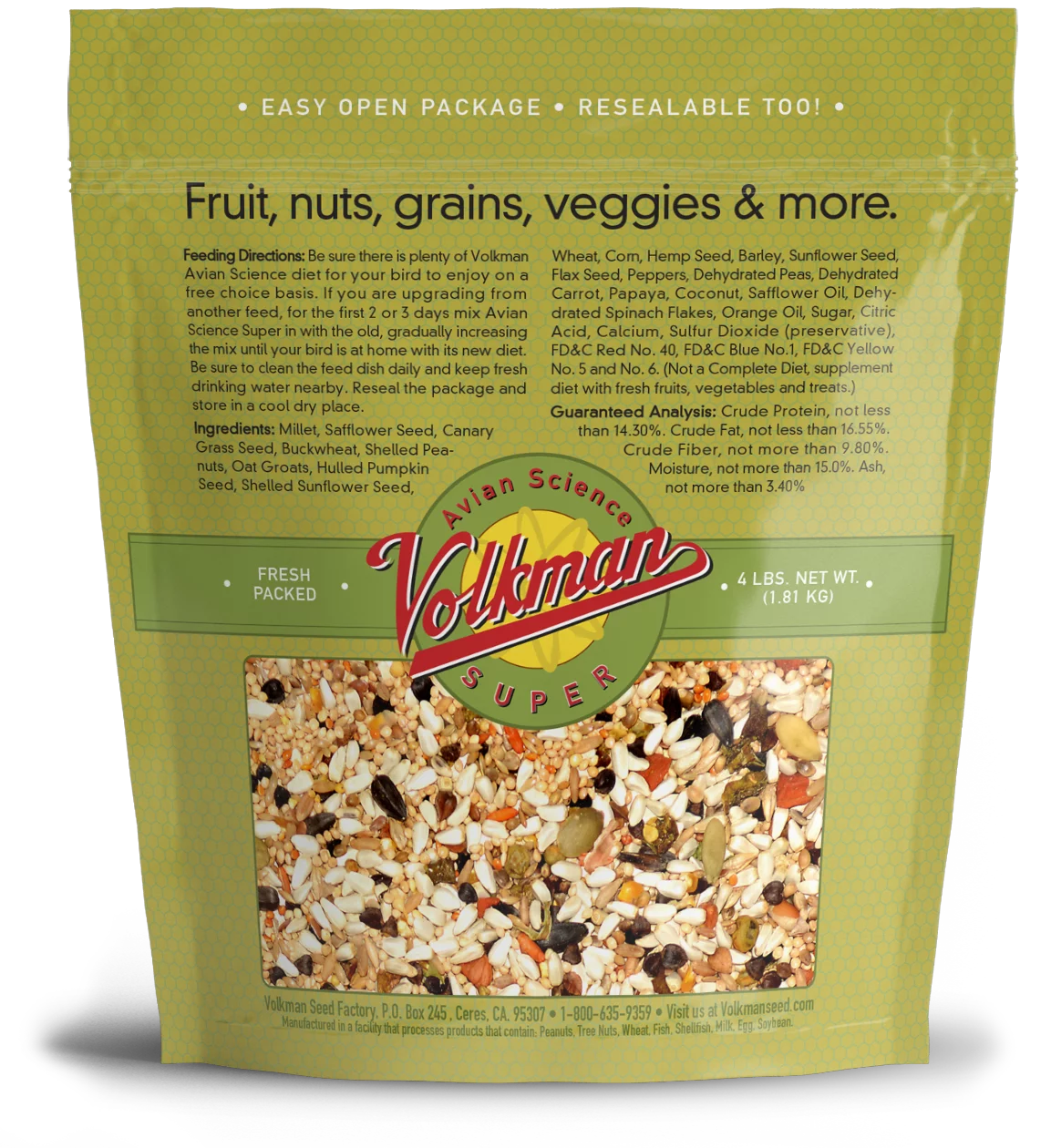 Millet, Safflower Seed, Canary Grass Seed, Buckwheat, Shelled Peanuts, Oat Groats, Hulled Pumpkin Seed, Shelled Sunflower Seed, Wheat, Corn, Flax Seed, Barley, Sunflower Seed, Peppers, Dehydrated Peas, Dehydrated Carrot, Papaya, Coconut, Safflower Oil, Dehydrated Spinach Flakes, Orange Oil, Sugar, Citric Acid, Calcium, Sulfur Dioxide (preservative), Vegetable/ Fruit Juice for color.