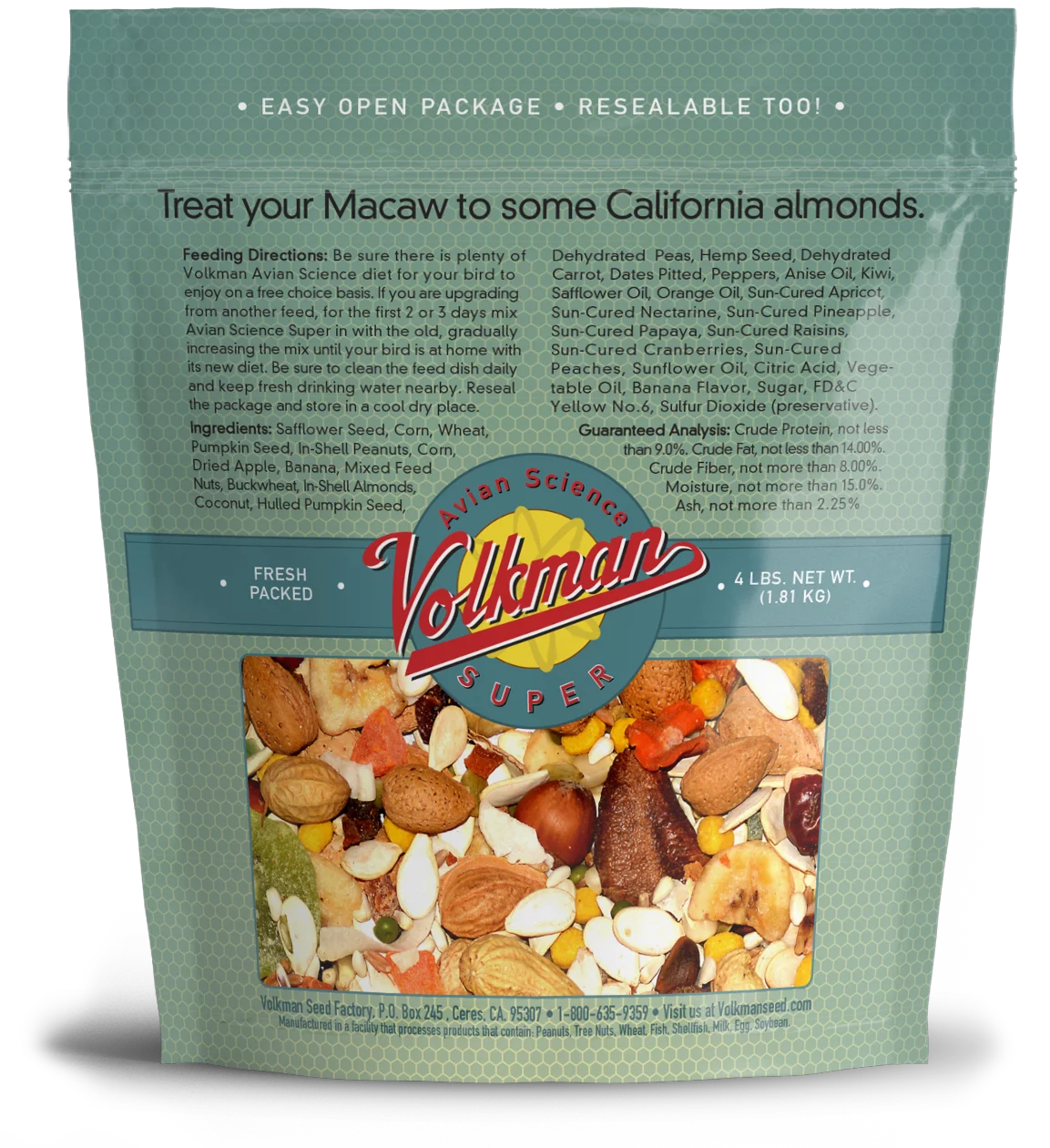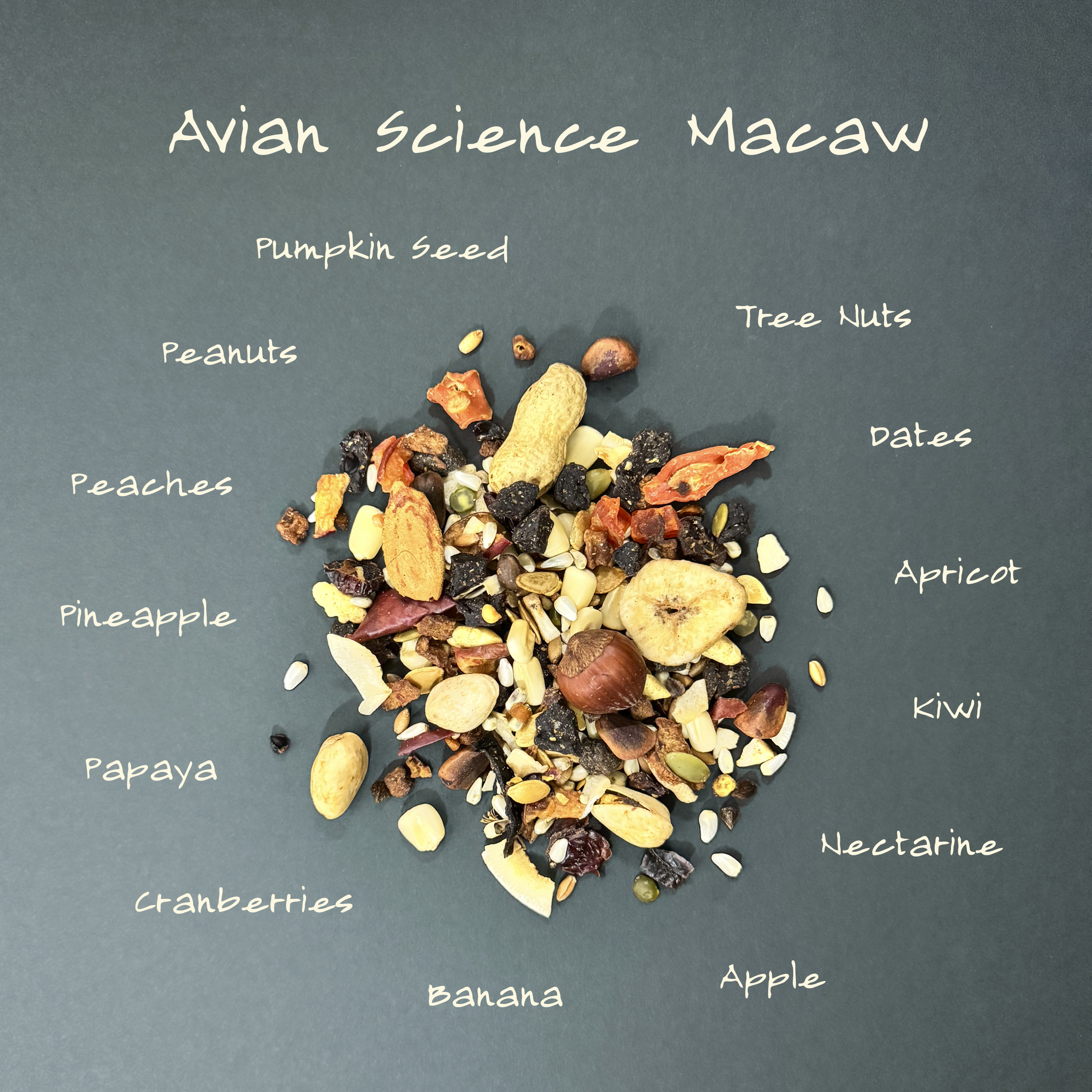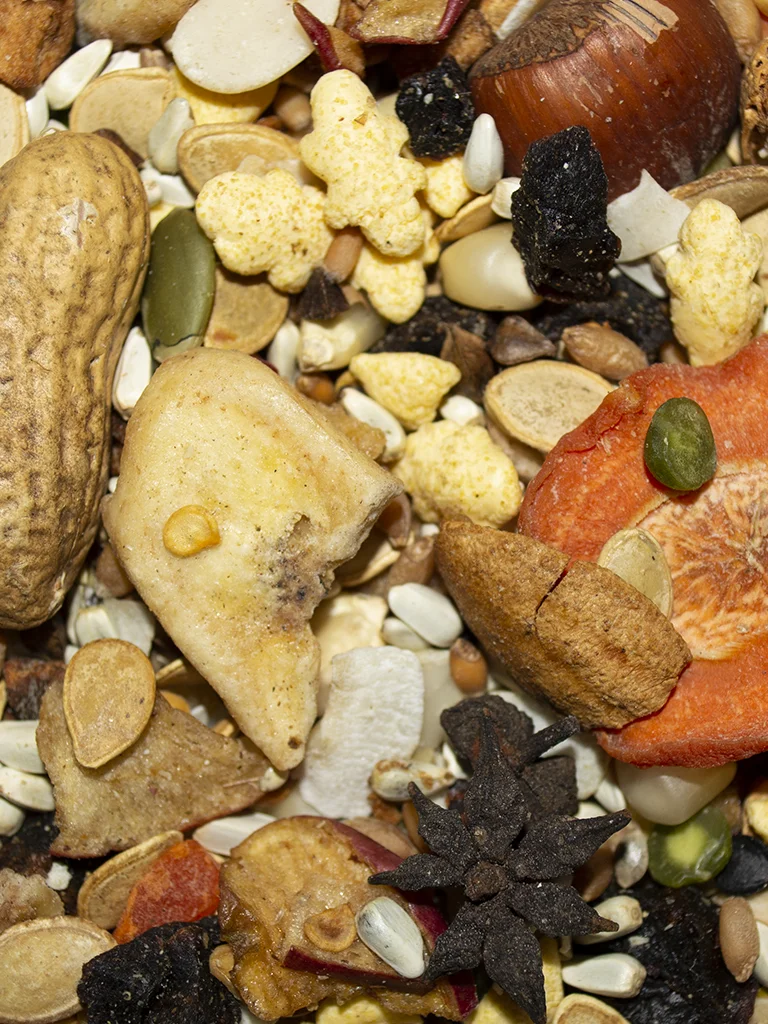 Safflower Seed, Corn, Wheat, Pumpkin Seed, In-Shell Peanuts, Corn, Dried Apple, Banana, Mixed Feed Nuts, Buckwheat, In-Shell Almonds, Coconut, Hulled Pumpkin Seed, Dehydrated Peas, Flax Seed, Dehydrated Carrot, Dates Pitted, Peppers, Anise Oil, Kiwi, Safflower Oil, Orange Oil, Sun-Cured Apricot, Sun-Cured Nectarine, Sun-Cured Pineapple, Sun-Cured Papaya, Sun-Cured Raisins, Sun-Cured Cranberries, Sun-Cured Peaches, Sunflower Oil, Citric Acid, Vegetable Oil, Banana Flavor, Sugar, Vegetable/ Fruit Juice for color, Sulfur Dioxide (preservative).