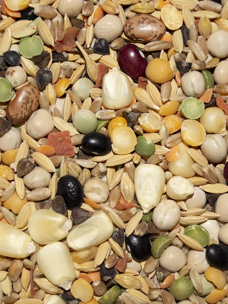 Dehydrated peas, rough rice, wheat, barley, buckwheat, corn, oat groats, lentils, beans, dehydrated carrot