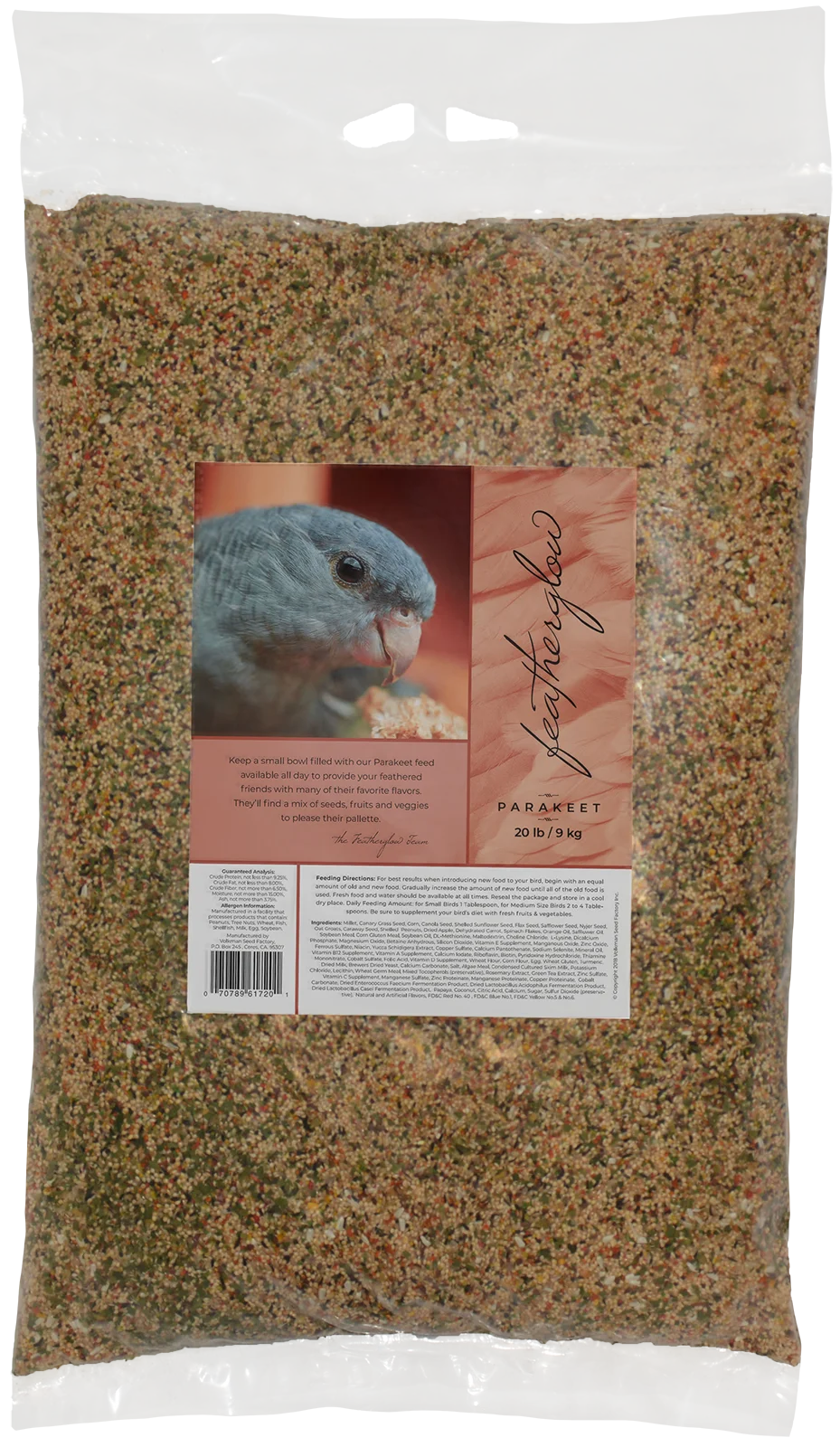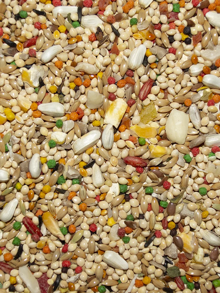 Millet, canary grass seed, corn, canola seed, shelled sunflower seed, flax seed, safflower seed, nyjer seed, oat groats, caraway seed, shelled peanuts, dried apple, dehydrated carrot, spinach flakes, orange oil, safflwer oil, soybean meal, corn gluten meal, soybean oil, DL-Methionine, maltodextrin, choline chloride, L-Lysine, dicalcium phosphate, magnesium oxide, betaine anhydrous, silicon dioxide, vitamin E supplement, vitamin B12 supplement, vitamin A supplement, calcium iodate, ribflavin, biotin, pyridoxine hydrochloride, thiamine mononitrate, cobalt carbonate, salt, algae meal, condensed cultured skim milk, potassium chloride, lecithin, wheat germ meal, mixed tocopherols (preservative), rosemary extract, green tea extract, zinc sulfate, vitamin C supplement, manganese sulfate, zinc proteinate, manganese proteinate, copper proteinate, cobalt carbonate, dried enterococcus faecium fermentation product, dried lactobacillus acidophilus fermentation product, dried lactobacillus casei fermentation product, papaya, coconut, citric acid, calcium, sugar, sulfur dioxide (preservative), natural and artificial flavors, Vegetable/ Fruit Juice for color