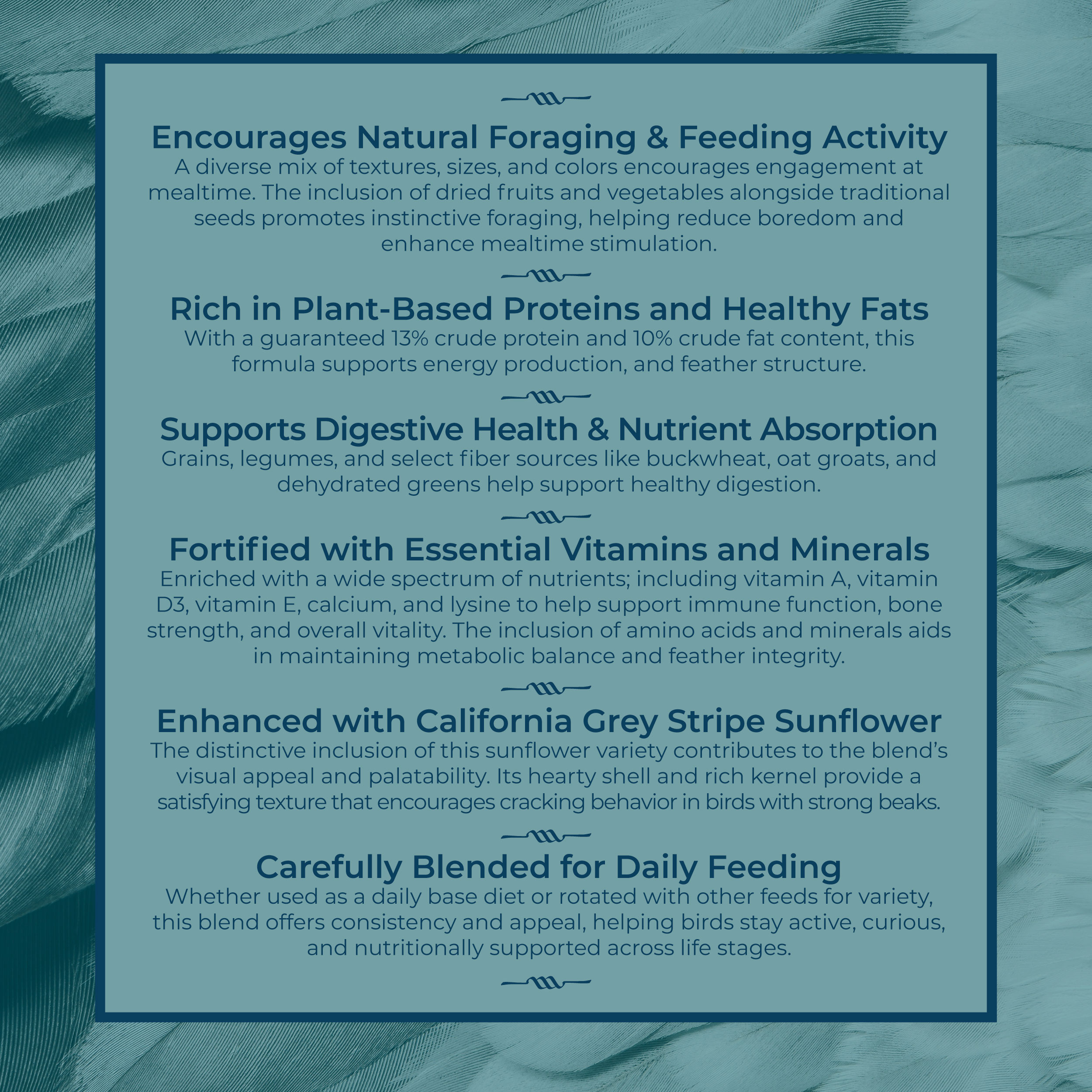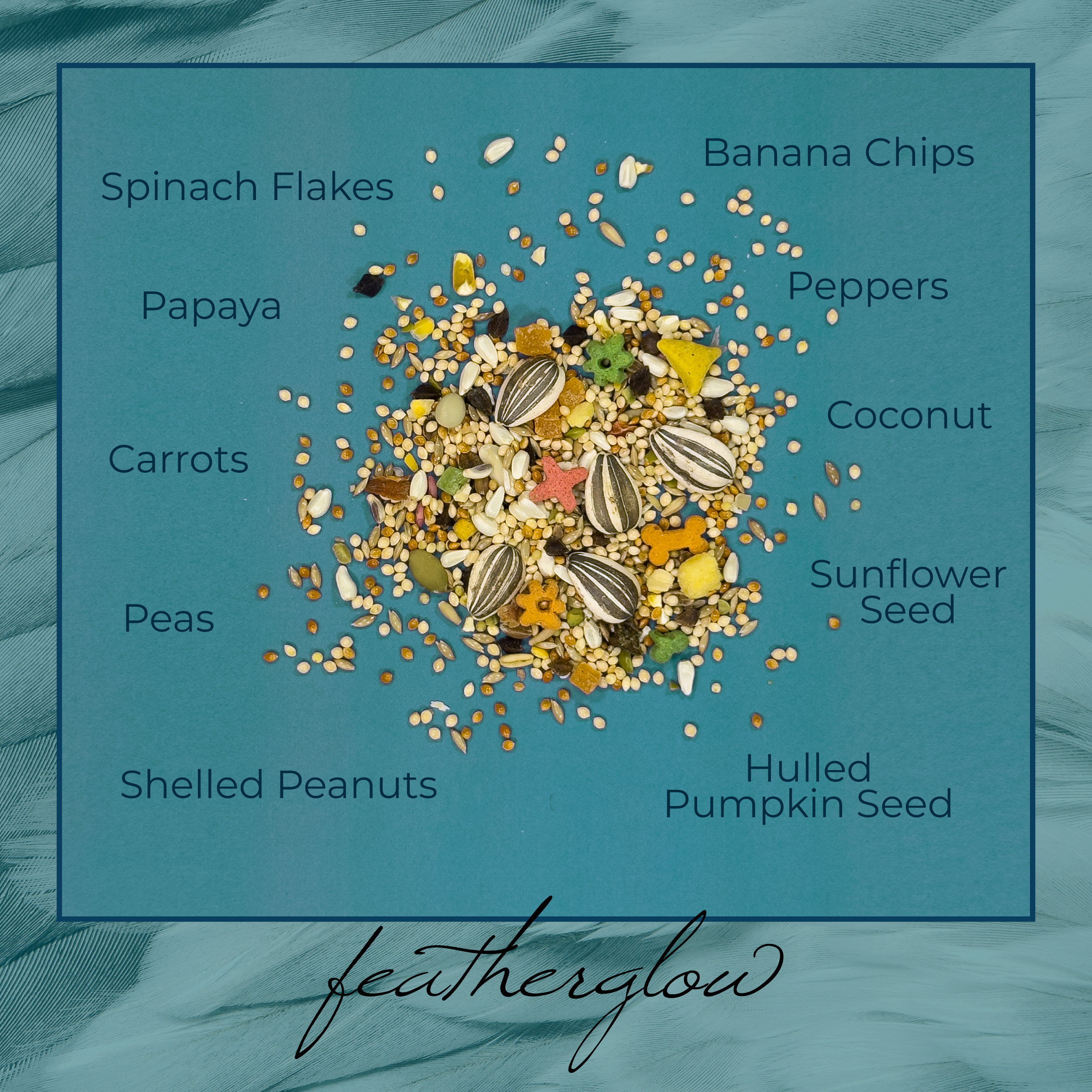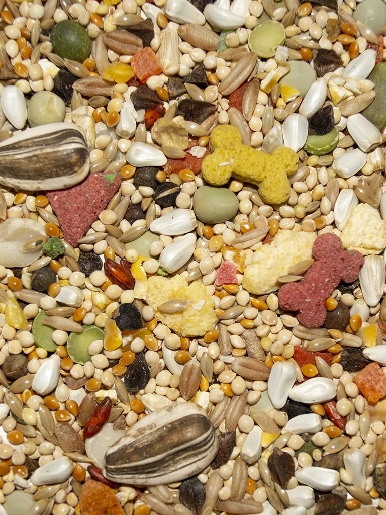 Millet, safflower seed, canary seed, buckwheat, oat groats, shelled peanuts, wheat, sunflower seed, corn, papaya, hulled pumpkin seed, dehydrated carrot, vetch, dehydrated peas, peppers, banana, coconut, dehydrated spinach flakes, safflower oil, orange oil, soybean meal, corn gluten meal, soybean oil, DL-methionine, maltodextrin, choline chloride, L-Lysine, dicalcium phosphate, magnesium oxide, betaine anhydrous, silicon dioxide, vitamin E supplement, vitamin C supplement, manganous oxide, zinc oxide, ferrous sulfate, niacin, yucca schidigera extract, copper sulfate, calcium pantothenate, sodium selenite, mineral oil, vitamin B12 supplement, vitamin A supplement, calcium iodate, riboflavin, biotin, pyridoxine hydrochloride, thiamine mononitrate, folic acid, vitamin D3 supplement, citric acid, calcium, vegetable oil, banana flavor, cobalt sulfate, natural & artificial flavors, Vegetable/ Fruit Juice for color, sulfur dioxide (preservative)