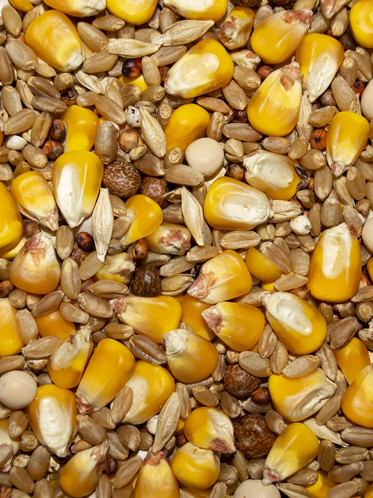 Corn, Wheat, Milo, Yellow Peas, Maple Peas, Barley and Safflower Oil.