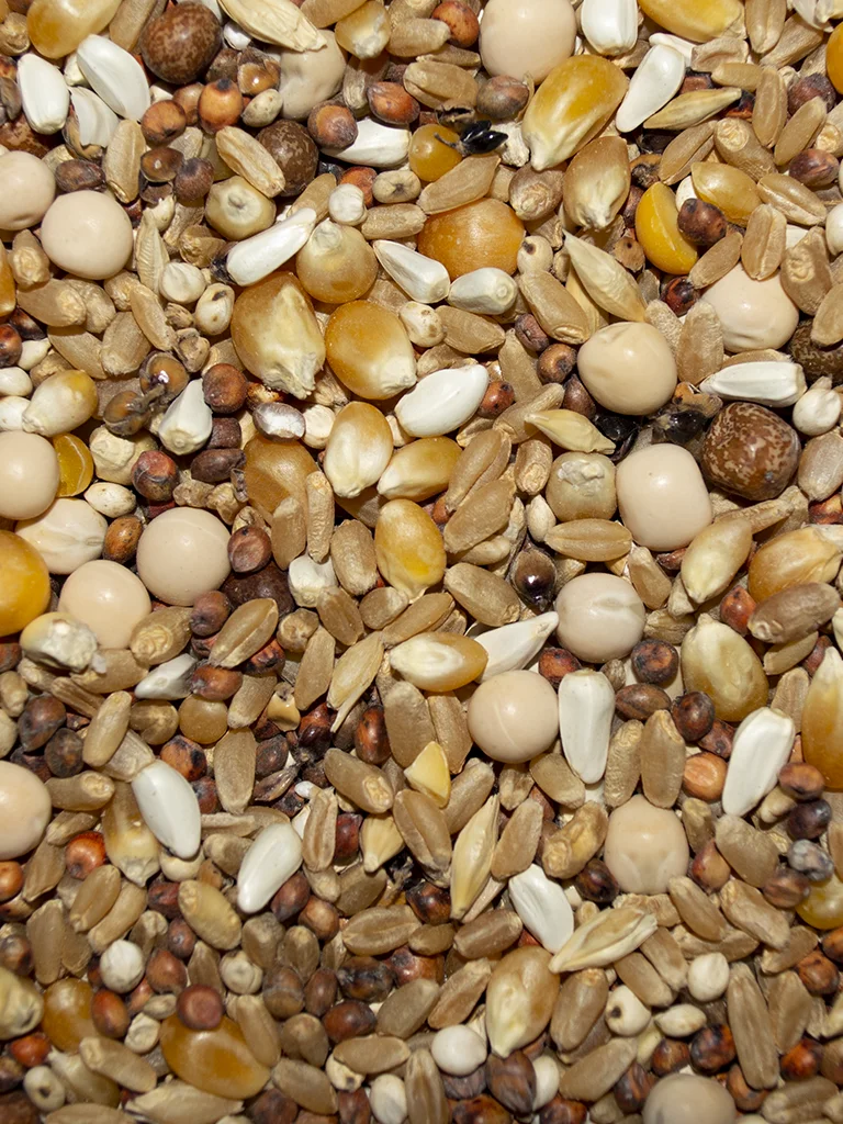 Wheat, Corn, Milo, Yellow Peas, Maple Peas, Oat Groats, Safflower Seed, Barley, Safflower Oil.